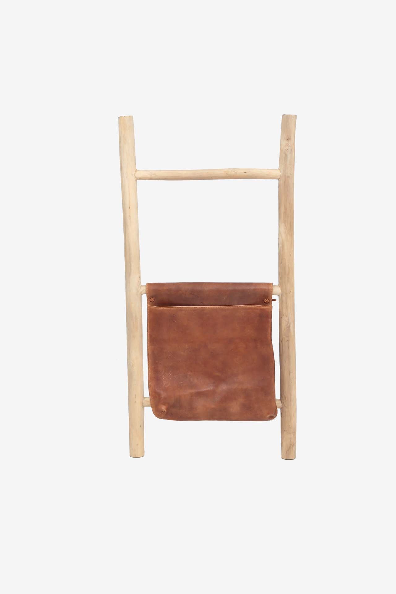 Magazine Rack Kuno 100 (50x5x100cm) made of teak branches and cognac colored cowhide. Recommended only for indoor use. Packaging 1 parcel / piece.